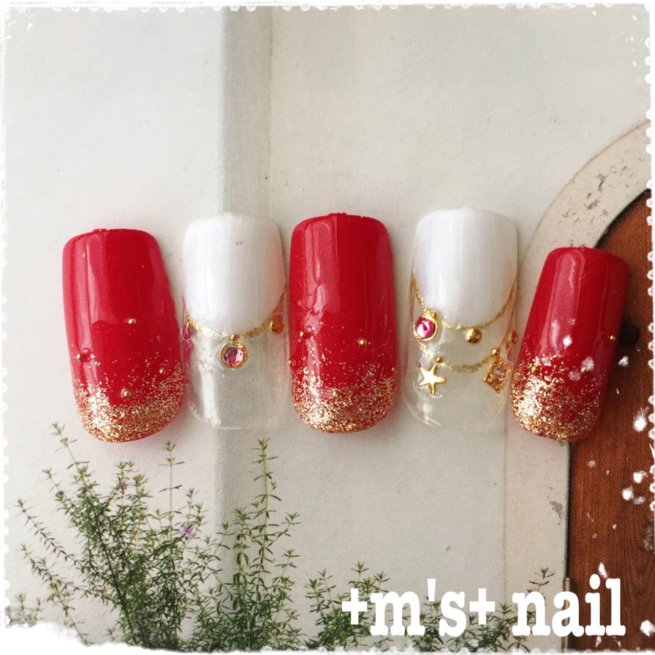 クリスマス ネイル 赤 ゴールド